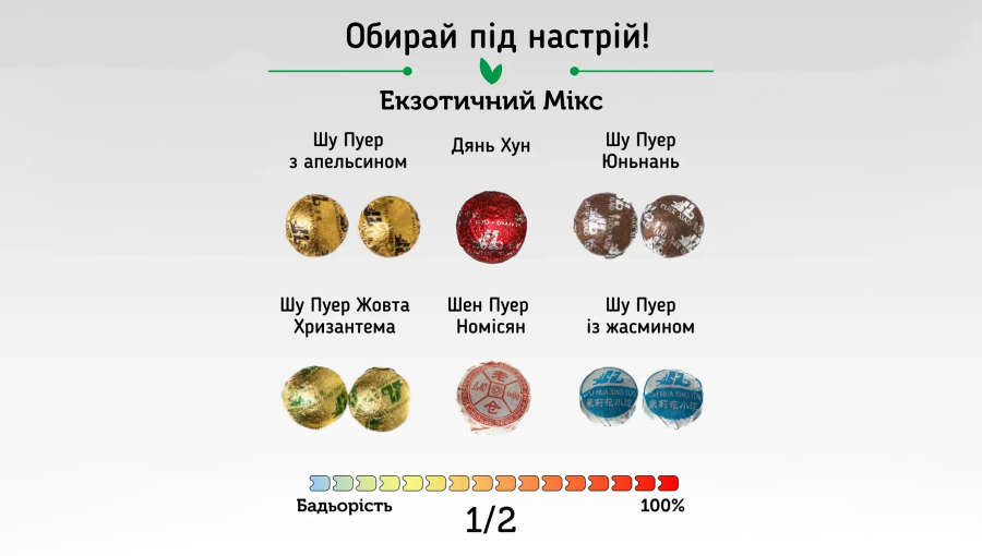 Познайомся з новим рівнем чайної насолоди — форматом міні-точок «Екзотичний Мікс» від New Tea, що включає 20 індивідуальних порцій преміального пуеру з 12 різними смаковими варіаціями. Ідеально для тих моментів, коли хочеться релаксу чи легкого тонусу під час гри, читання або просто затишного вечора.