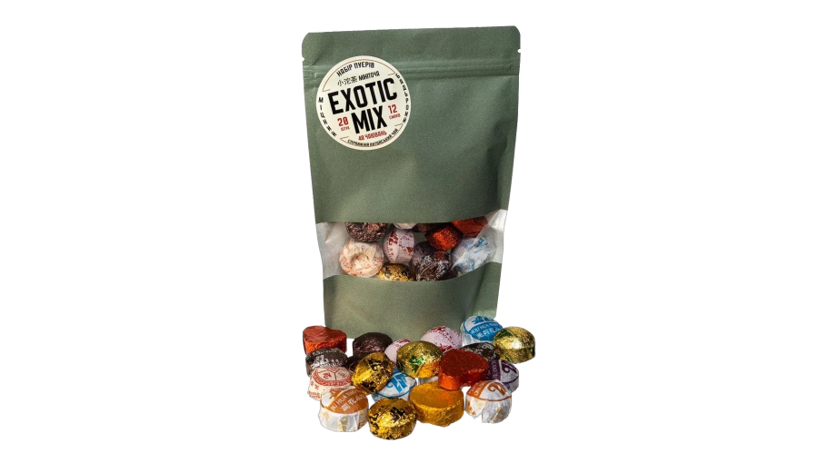 Цей набір — Чай у Міні‑Точках Пуер New Tea 20 Порцій «Екзотичний Мікс» — це шу пuer (темна ферментація) з провінції Юньнань, Китай. Формат: 20 порцій — кожна індивідуально упакована міні-точка, що забезпечує свіжість і зручність. Склад включає 12 різних смаків: фруктові, квіткові, трав’яні та цитрусові варіації. Рекомендовано заварювати гарячою водою (~90-100 °С) для повного розкриття букета. Упаковка — дой-пак із zip-lock для зручного зберігання.