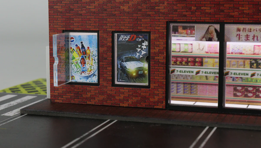 Масштаб 1:64 є стандартом для більшості колекційних авто, тому точність пропорцій у діорамі має вирішальне значення. G-Fans 7-Eleven Diorama виконана з урахуванням реальних розмірів будівель, входів, вітрин і прилеглого простору. Завдяки цьому машинки не виглядають завеликими або зменшеними, а сцена сприймається як цілісна міська локація. Саме правильний масштаб робить такі діорами популярними серед колекціонерів, які цінують автентичність і візуальну логіку експозиції.