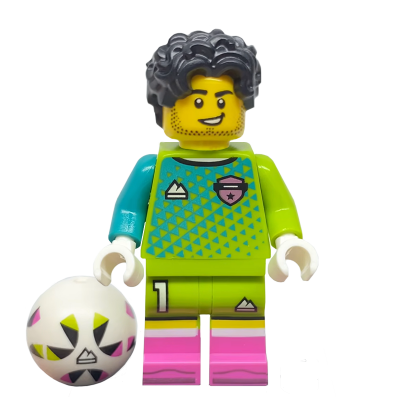 Мініфігурка Football Goalkeeper виділяється своєю неоновою кольоровою гамою, яка імітує сучасну професійну екіпіровку воротарів вищих ліг. Основний колір форми — яскраво-салатовий, доповнений стильним геометричним патерном на торсі та контрастними рожевими гетрами. Рукава фігурки мають асиметричне забарвлення: один — блакитний, інший — салатовий, що додає образу динамічності та індивідуальності. На грудях чітко видно емблему клубу та логотип виробника екіпіровки, а на шортах красується номер «1», підкреслюючи статус першого номера команди.