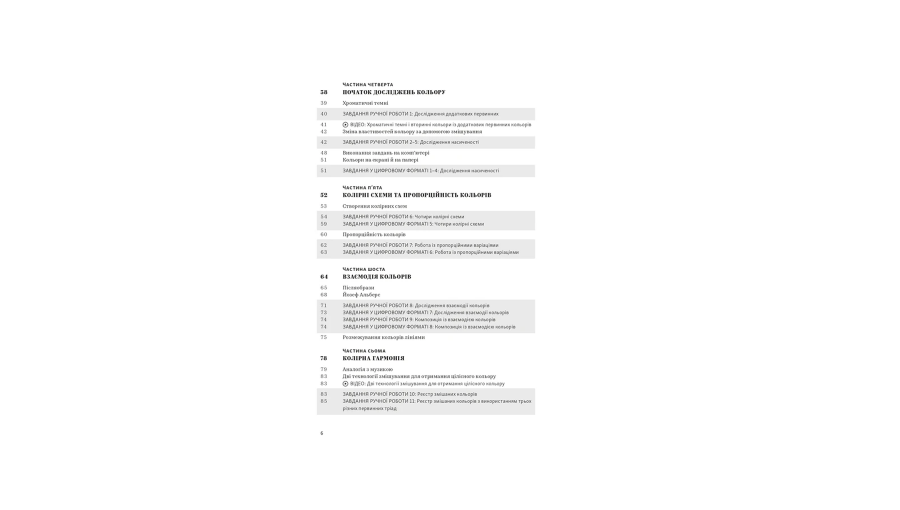 У книзі детально розглядаються основи кольорознавства: колірне коло, гармонії, контрасти, насиченість, світлота та температура кольору. Девід Горнунг подає матеріал у форматі практикуму — з вправами, прикладами та наочними ілюстраціями, які допомагають одразу закріпити знання на практиці. Особлива увага приділяється тому, як колір працює в ілюстрації, живописі, графічному та цифровому дизайні, а також у створенні візуальних концепцій.