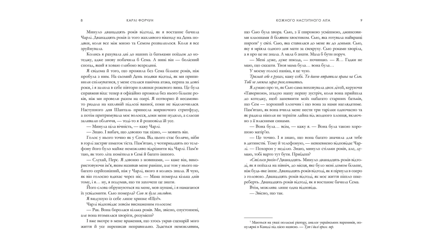 Кожного наступного літа написана авторкою Карлі Форчун і поєднує романтичну історію з ностальгією за юністю та літніми канікулами. Сюжет розгортається у двох часових лініях — у минулому, коли герої проводять разом кожне літо в маленькому містечку біля озера, та в теперішньому, коли через роки вони знову зустрічаються і намагаються зрозуміти, що сталося між ними. Книга має зручний формат, якісний друк і стильне оформлення, а сама історія відзначається емоційною глибиною, легкою мовою та атмосферою спогадів, що робить читання захопливим і дуже живим.