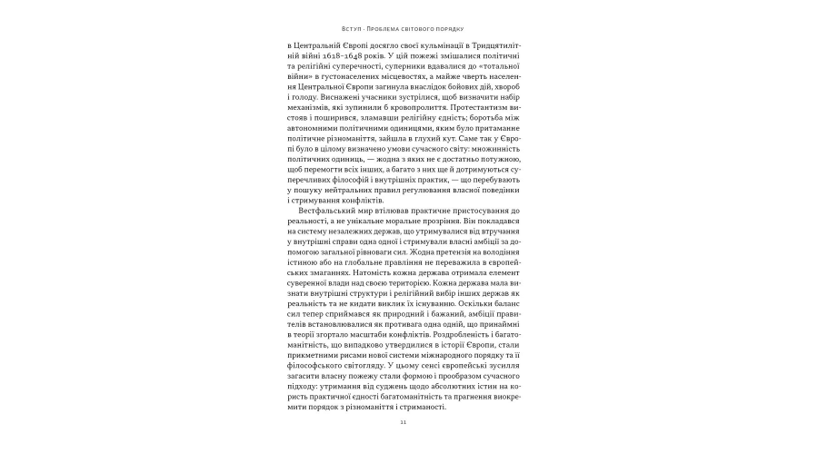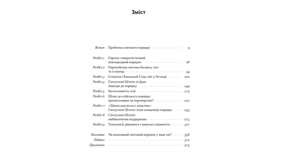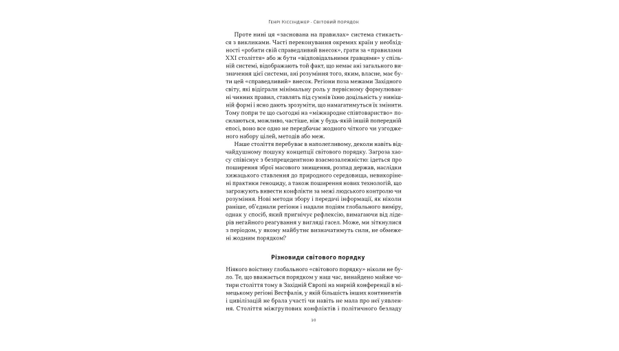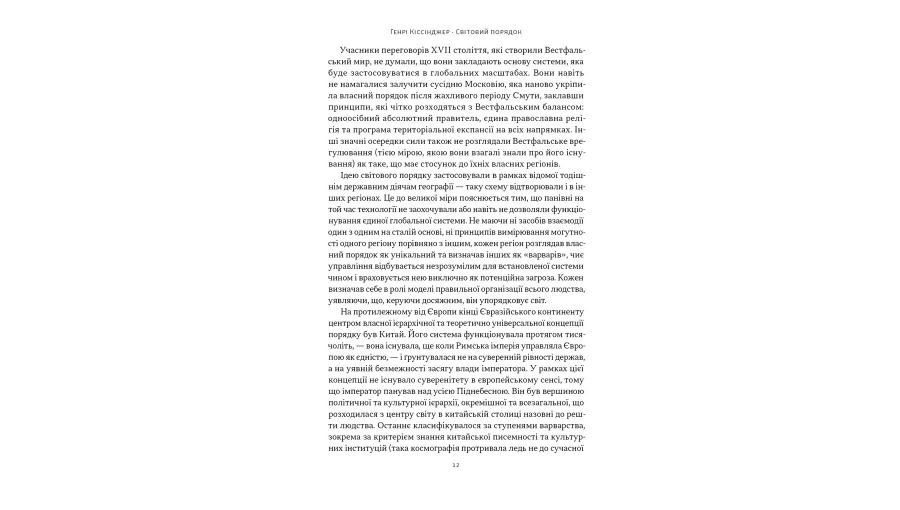 Кіссінджер досліджує, як різні нації виробляли свої уявлення про політичний порядок. Він проводить читача від Вестфальської системи в Європі до величних імперських традицій Китаю та стратегічних підходів ісламського світу. Кожна цивілізація, за словами автора, мала власний характер і логіку розвитку, що визначала її роль у глобальному балансі сил. Історичні події стають не просто фактами, а ключами до розуміння того, як сьогодні формується міжнародна арена.