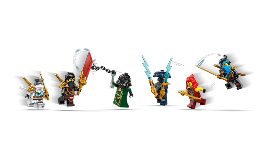 Мініфігурки ключових героїв Ninjago з новими костюмами та зброєю.