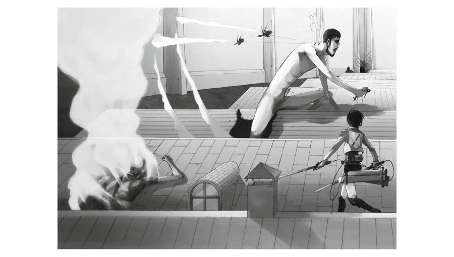 Манґа «Атака титанів». Том 4 вирізняється похмурою, тривожною атмосферою. Малюнок Ісаями підсилює відчуття безнадії та постійної загрози: тісні простори, зруйновані міста, гігантські постаті титанів. Візуальна подача ідеально доповнює сюжет, а динамічні сцени боїв поєднуються з деталізованими емоційними моментами.