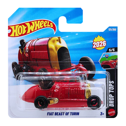 Fiat S76 був створений у 1910 році з єдиною метою — побити рекорд швидкості, і для цього італійські інженери встановили на шасі колосальний чотирициліндровий двигун об'ємом 28,3 літра. Компанія Mattel з неймовірною точністю передала силует цього гіганта в лінійці Basic. Модель виконана у насиченому червоному кольорі, який підкреслює її приналежність до золотої ери італійського автоспорту. Корпус виготовлений за технологією Die-cast, що гарантує довговічність та приємну вагу моделі в руках. Особливу увагу в цій ітерації приділено відкритому верху, що відповідає концепції серії Drop Tops. Ви можете розгледіти деталізацію кабіни, масивний капот, під яким у реального прототипу ховалися сотні кінських сил, та характерні вихлопні труби. Колеса підібрані в автентичному стилі тих часів, що додає моделі особливого шарму ретро-футуризму. Незважаючи на свій поважний вік як прототипу, ця металева машинка ідеально працює на фірмових треках, демонструючи чудову аеродинаміку та накат завдяки якісним осям.