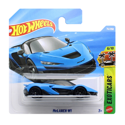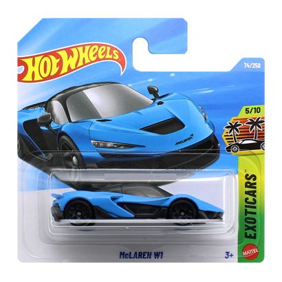 Модель виконана у масштабі 1:64, класичному для Hot Wheels, і входить до серії Exotics, яка зосереджена на сучасних суперкарах та концептуальних авто. Корпус виготовлений з металу з використанням міцних пластикових елементів, а насичений синій колір підкреслює аеродинамічні лінії McLaren W1.