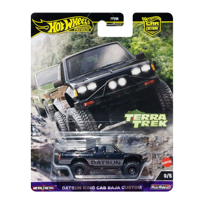 Машинка виконана у масштабі 1:64 з повністю металевим кузовом і шасі (Metal/Metal), що є стандартом для лінійки Hot Wheels Premium. Дизайн Datsun King Cab Baja Custom натхненний класичними пікапами для пустельних перегонів Baja: піднята підвіска, масивні колеса з гумовими шинами Real Riders, агресивний силует та офроуд-деталі. Версія Chase у чорному кольорі (Black) вирізняється рідкісністю та особливою цінністю серед колекціонерів. Артикул HRV92 підтверджує оригінальність і приналежність до серії Terra Trek.