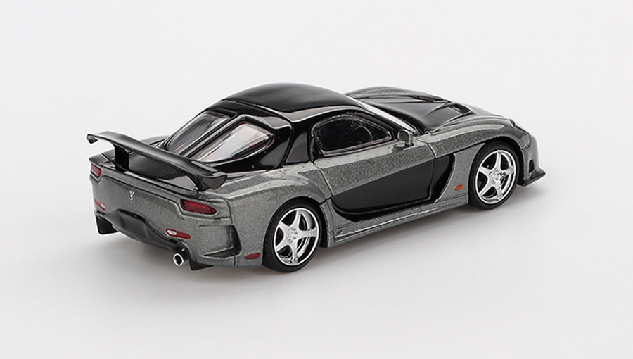 Машинка належить до серії MINI GT, яка славиться своєю високою деталізацією і реалістичним відтворенням всіх елементів оригіналу. Сірий колір кузова додає автомобілю елегантності та агресивності, підкреслюючи спортивний характер Mazda RX-7. Завдяки точному відтворенню деталей кузова, коліс і внутрішніх елементів, ця модель виглядає так, наче готова до динамічних перегонів.