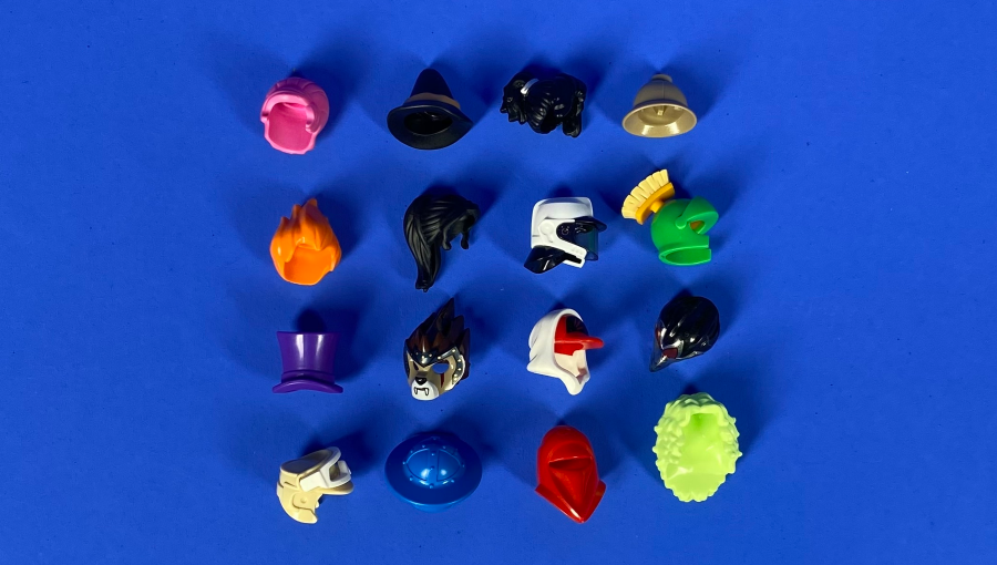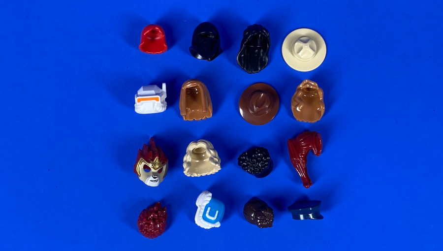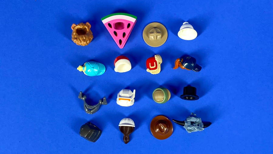 Асортимент включає: класичні зачіски, спортивні кепки, піратські та лицарські шоломи, фантастичні та тематичні варіанти для різних серій LEGO. Такі аксесуари допоможуть завершити образ або додати свіжі емоції до будь-якої фігурки.