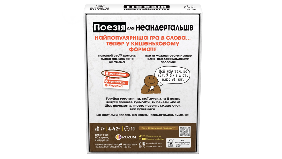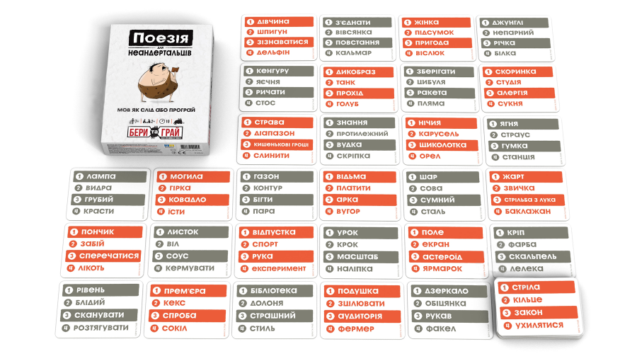Ця настільна гра має неймовірно високий рівень реіграбельності завдяки величезній кількості комбінацій слів та непередбачуваності людського мислення в стресових умовах. Вона ідеально підходить для великих компаній, де потрібно швидко розтопити лід між гостями, а також для сімейних вечорів, адже діти часто справляються з поясненнями простими словами навіть краще за дорослих. Поезія для Неандертальців: Бери та Грай тренує швидкість реакції, кмітливість та здатність відсікати зайве, залишаючи лише суть. Це кооперативний і змагальний досвід водночас, який об’єднує людей різного віку та інтересів навколо спільної мети — зрозуміти один одного без зайвого пафосу та складних термінів. Якщо ви шукаєте гру, яка гарантовано створить позитивну атмосферу та залишить яскраві спогади, цей примітивний, але геніальний симулятор неандертальця стане найкращим вибором.