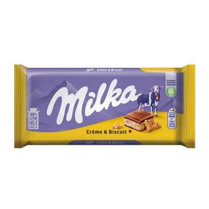 Milka використовує альпійське молоко, що надає шоколаду м’якої, вершкової текстури. Усередині — ніжний молочний крем, який контрастує з хрусткими бісквітними крихтами. Такий баланс текстур створює багатогранний смаковий досвід: спочатку тане шоколад, потім розкривається кремова солодкість і легкий хрускіт печива.