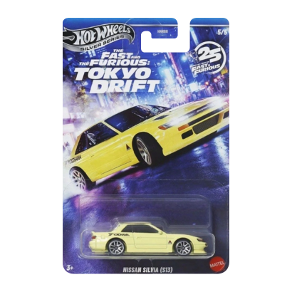 Модель виготовлена з литого металу з якісними пластиковими елементами, що забезпечує міцність і довговічність. Hot Wheels точно відтворили впізнавані риси Nissan Silvia (S13): компактний кузов, низьку посадку, спортивні пропорції та характерну форму передньої частини. Вільний хід коліс дозволяє використовувати машинку на треках і в сюжетних іграх, а акуратне фарбування у жовтому кольорі підкреслює преміальний статус тематичної серії Fast & Furious.