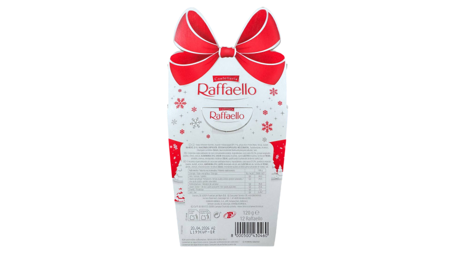 Ferrero Rocher Raffaello Рождественские 120g — это не просто набор конфет, а настоящий праздничный шедевр, воплощающий итальянскую элегантность, изящество и нежность в каждом кусочке. Упакованные в стильную рождественскую коробку, эти конфеты станут не только отличным подарком, но и символом тепла, заботы и праздника. Они созданы, чтобы добавить утончённого удовольствия в каждый зимний день — от семейного вечера до корпоративного торжества.