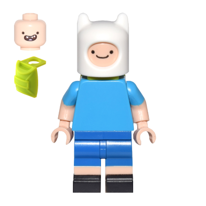 Модель с артикулом dim038 является уникальным воплощением персонажа, которое выделяется среди стандартных минифигурок своей конструкцией и аксессуарами. Главная особенность этой фигурки — её белый шлем-капюшон с характерными «ушками», который является несъемной частью головы, идеально повторяющей силуэт Финна из мультфильма. Выражение лица персонажа — это классическая уверенная улыбка, излучающая оптимизм. Торс фигурки выполнен в небесно-голубом цвете с лаконичным принтом, имитирующим его футболку, а синие короткие шорты дополняют образ. На спине у Финна расположен неотъемлемый атрибут путешественника — зеленый рюкзак, который крепится на шею фигурки.