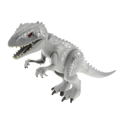 Фигурка LEGO Indominus Rex indorex02 выполнена в светло-сером цвете с характерными серебристыми пятнами, которые делают её легко узнаваемой. Такая особенность отсылает к дизайну динозавра в фильмах.