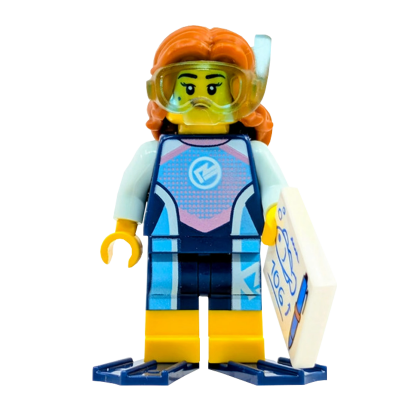 Гидрокостюм: Минифигурка одета в стильный темно-синий гидрокостюм с бирюзовыми акцентами и принтом логотипа океанографической станции. Детализация охватывает как торс, так и ноги, создавая целостный образ профессионального дайвера.