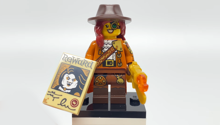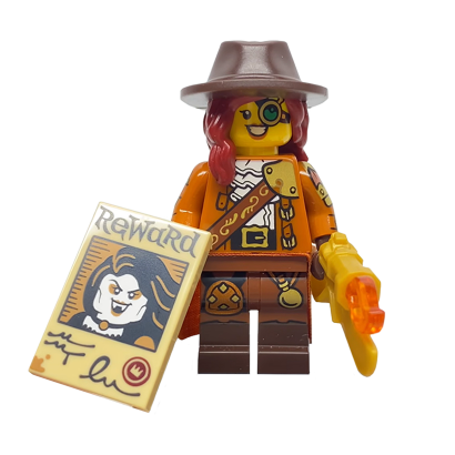Техническое исполнение фигурки соответствует самым высоким стандартам LEGO. Торс и ноги имеют круговой принт, создающий целостный образ опытной воительницы. Уникальным аксессуаром является плакат «Reward» (Награда) с изображением вампира — это эксклюзивная деталь, которая делает фигурку желанной для тех, кто строит собственные диорамы. В руках охотница держит футуристичный золотистый арбалет или гаджет с полупрозрачным элементом, символизирующим энергетический выстрел или магическую ловушку. Использование прочного ABS-пластика гарантирует, что принты не сотрутся даже после длительного использования в игре.