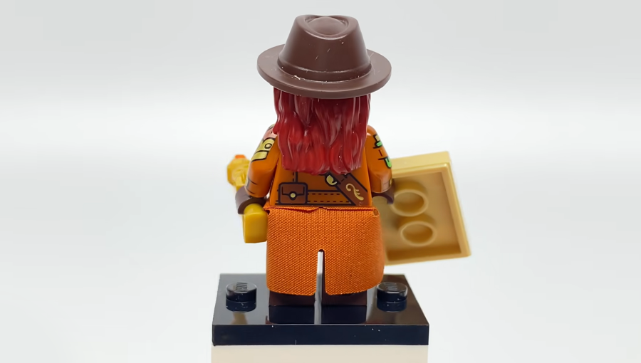 Коллекционная минифигурка Monster Hunter поражает своей цветовой гаммой и качеством принтов. Основной цвет её наряда — насыщенный оранжевый, напоминающий кожаный охотничий доспех, украшенный золотистыми пряжками и детализированным ремнем через плечо. Особое внимание привлекает лицо персонажа: одна сторона демонстрирует уверенную улыбку с окуляром-моноклем, что подчеркивает её технологическое превосходство над монстрами. Рыжие волосы, выбивающиеся из-под широкополой коричневой шляпы, добавляют образу динамичности.