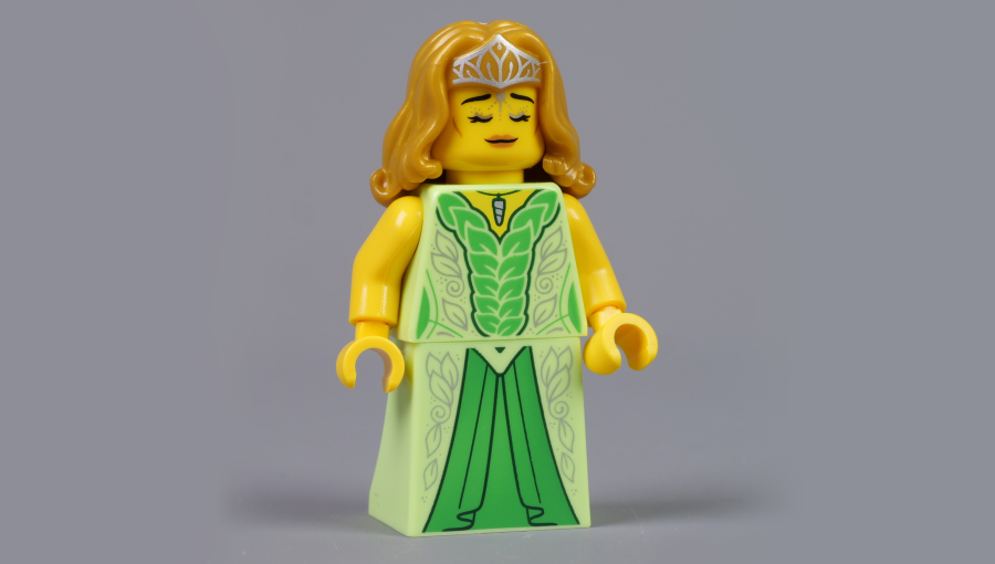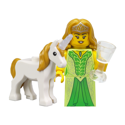 Фигурка Unicorn Elf поражает своим изяществом и вниманием к деталям, которые мы можем видеть на реальных фото. Минифигурка имеет роскошные длинные волосы золотисто-коричневого цвета, украшенные изысканной серебристой тиарой, подчеркивающей её королевский или магический статус. Лицо эльфийки имеет мягкое, приветливое выражение с легкой улыбкой. Её наряд — это настоящий шедевр миниатюрного искусства. Торс и элемент-юбка (напоминающая полноценное платье) выполнены в насыщенном светло-зеленом цвете. На ткань нанесен детализированный принт в виде стилизованного плетения листьев и лесных узоров. Передняя панель юбки выделена темно-зеленой вставкой, создающей иллюзию цельного платья. Дизайнеры LEGO использовали премиальный пластик, обеспечивающий долговечность и насыщенность цветов. В правой руке эльфийка держит изящный прозрачный кубок, что добавляет образу аристократизма. Высота фигурки стандартная для минифигурок, но за счет тиары и платья она выглядит чуть выше. Качество исполнения каждого элемента соответствует высочайшим стандартам бренда, что делает этот набор желанным приобретением.