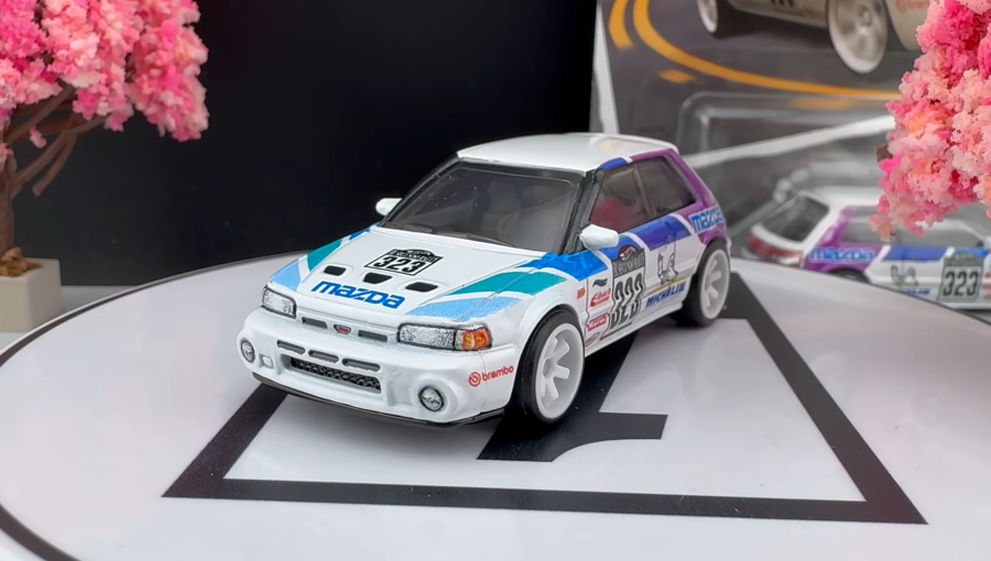 Модель Mazda 323 GTR выполнена с максимальным вниманием к мелочам, что выделяет линейку Premium среди остальных. Использование конструкции Metal/Metal обеспечивает модели приятную тяжесть и прочность, так как и корпус, и шасси изготовлены из металлического сплава. Главной особенностью являются колеса Real Riders — аутентичные диски с мягкими резиновыми шинами, имеющими детализированный рисунок протектора. Белый цвет кузова подчеркивает агрессивные черты переднего бампера с большими отверстиями для охлаждения и характерный спойлер на крыше. Тампопечать выполнена на высоком уровне: четко прорисована передняя и задняя оптика, логотипы бренда и даже мельчайшие решетки радиатора. Салон модели проработан с учетом геометрии реального прототипа, что делает этот экземпляр в масштабе 1:64 настоящим шедевром миниатюрного моделирования.