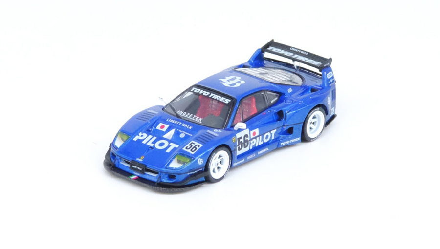 Модель выполнена в масштабе 1:64 с металлическим кузовом die-cast, что обеспечивает приятный вес и ощущение коллекционного продукта. INNO64 известен вниманием к мелочам, и эта Ferrari F40 не исключение: точные пропорции кузова, реалистичная форма оптики, детализированные диски, заниженная посадка и характерный widebody-обвес Liberty Walk. Насыщенный синий цвет, посвященный Tokyo Auto Salon 2024, выглядит глубоко и эффектно, выгодно выделяя модель среди классических красных F40.