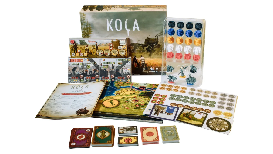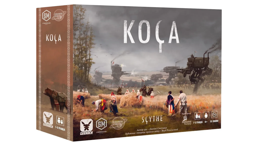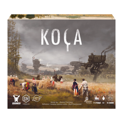 В «Косе» игроки ходят по очереди, планируя свои действия на асимметричных планшетах. Ключ к победе — разумное чередование верхних и нижних действий. Вы будете перемещать героя и мехов, производить ресурсы на гексах, торговать и возводить здания. Освойте искусство модернизации, чтобы сделать свой планшет эффективнее, или вербуйте рекрутов для получения постоянных бонусов. Помните о Фабрике в центре карты: тот, кто контролирует ее, получает доступ к уникальным технологиям, способным в корне изменить ход игры.
