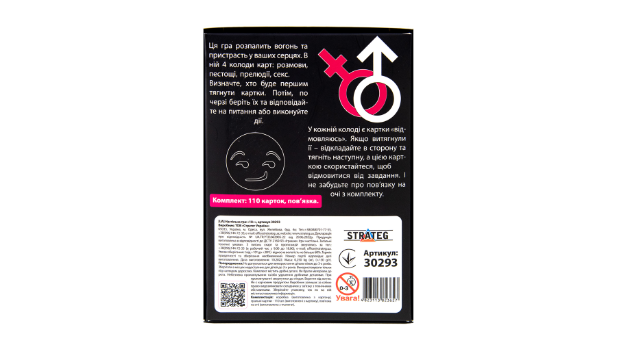 Strateg Прелюдия 18+ — это современная игровая система для взрослых, сделавшая ставку на поэтапное раскрытие партнеров, открывая новые грани взаимодействия. Набор включает колоду специально разработанных карточек с заданиями и вопросами разного уровня интенсивности, что позволяет игрокам самостоятельно регулировать темп игры. Дизайн карточек выполнен в стильном, сдержанном оформлении на качественном картоне, что обеспечивает долговечность и приятные тактильные ощущения, а компактная конструкция коробки отличается практичностью, позволяя сохранять конфиденциальность и легко брать игру с собой в путешествие. В комплект входит инструкция, предлагающая четкие правила, что гарантирует комфортную эргономику игрового процесса и позволяет полностью раскрыть потенциал пары, создавая атмосферу доверия и легкого игрового напряжения.
