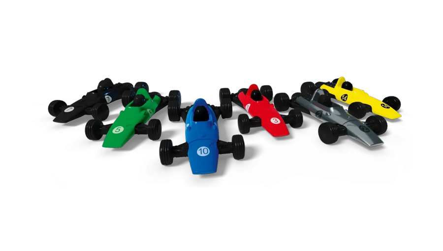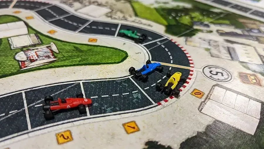 Игрок раскрывает карты, подсчитывает скорость и перемещает болид вперёд. Обгон возможен, но если клетка занята — придётся остановиться раньше.